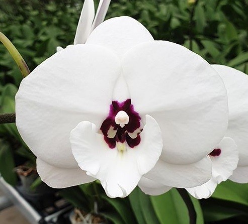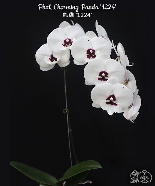 Phal. Charming Panda 1224 – эффектный гибрид с чисто-белыми лепестками и чернильными росчерками возле колонки и на большой губе, напоминающими окрас панды.