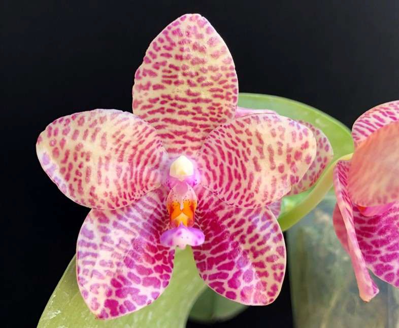 Окраска напоминает природный камуфляж тропических лесов: тёплая кремовая основа покрыта мягким розово-малиновым крапом, словно следы солнечного света, пробивающегося сквозь листву. Рисунок не резкий, а живой и органичный — как будто цветок вырос таким сам, без вмешательства человека. Центр цветка аккуратный, естественный, подчёркивающий баланс формы, а не доминирующий над ней.