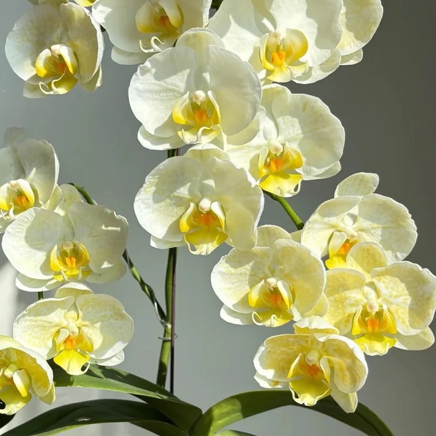 Phal. Golden Lace – редкий и изысканный фаленопсис, который сразу привлекает внимание своей благородной, утончённой окраской. Многочисленные цветки нежного кремово-сливочного оттенка словно подсвечены мягким золотистым сиянием. В центре каждого цветка — яркая жёлтая губа с тёплыми медовыми и апельсиновыми акцентами, создающая красивый контраст и придающая композиции глубину.
