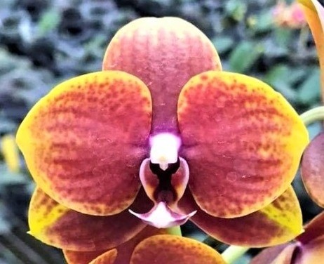 Эта орхидея словно соткана из бархата закатных небес. Её лепестки окрашены в глубокий винно-бордовый оттенок, а по краям мерцает золотистое сияние, будто солнечный свет коснулся нежных крыльев бабочки. Бело-розовая губа — изысканный штрих, добавляющий цветку утончённости и гармонии.