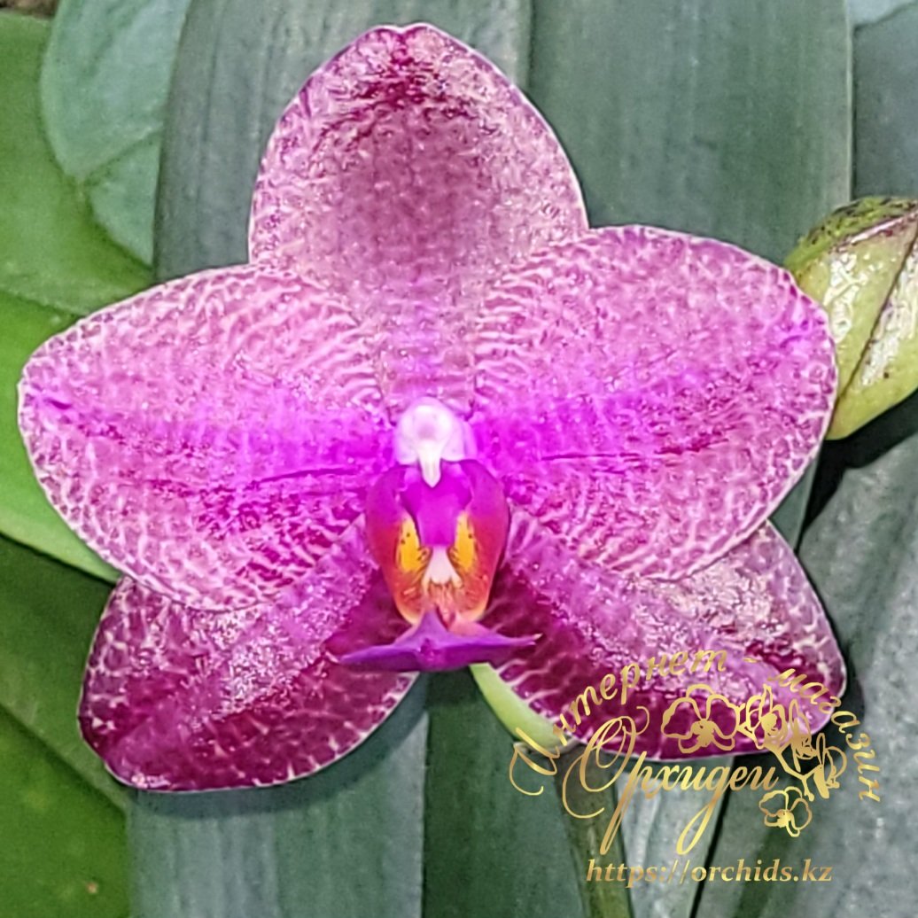 Эта орхидея поражает воображение своими восковыми цветками глубокого, насыщенного фуксиевого или пурпурно-малинового цвета. По всей поверхности лепестков отчетливо видны более темные крапинки и прожилки, создающие уникальный сетчатый узор. Центр цветка, или губа, имеет более светлый оттенок с вкраплениями оранжевого или желтого, добавляя контраста и глубины. В целом, рисунок напоминает загадочный узор, словно сошедший с восточного шелка.